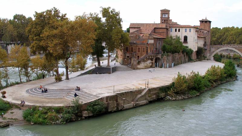 La minuscola isola Tiberina, caratterizza il percorso del Tevere proprio nel pieno centro di Roma. Larga una novantina di metri e lunga circa trecento, è unita alla terraferma grazie al Ponte Fabricio del 62 a.C. che la collega al lato del Campidoglio e dal Ponte Cestio del 46 a.C. che la collega al rione di Trastevere.
